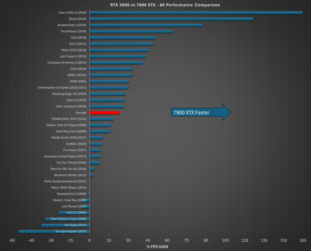 The table below shows the average FPS for the two cards at 4K and 8K resolution. The list is sorted by year of release of the benchmark. Overall, the 7900 XTX is around 25% faster in the selected titles.